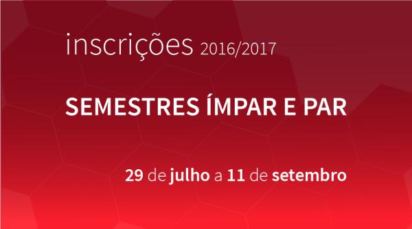 As inscrições deverão ser efetuadas nas unidades curriculares obrigatórias e optativas que o estudante pretende frequentar nos semestres ímpar e par de 2016/2017, decorrendo de 29 de julho a 11 de setembro o único período de inscrições para o próximo ano letivo.